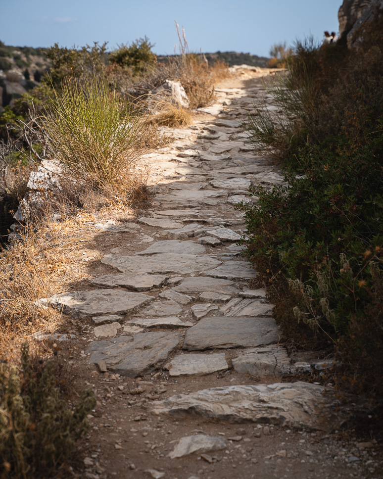 This first section already offers beautiful views back towards Lefkes, with its cluster of houses and the church dome framed by the surrounding hills. It’s a lovely spot to stop for a last village photo before you properly “step into history” on the ancient road.